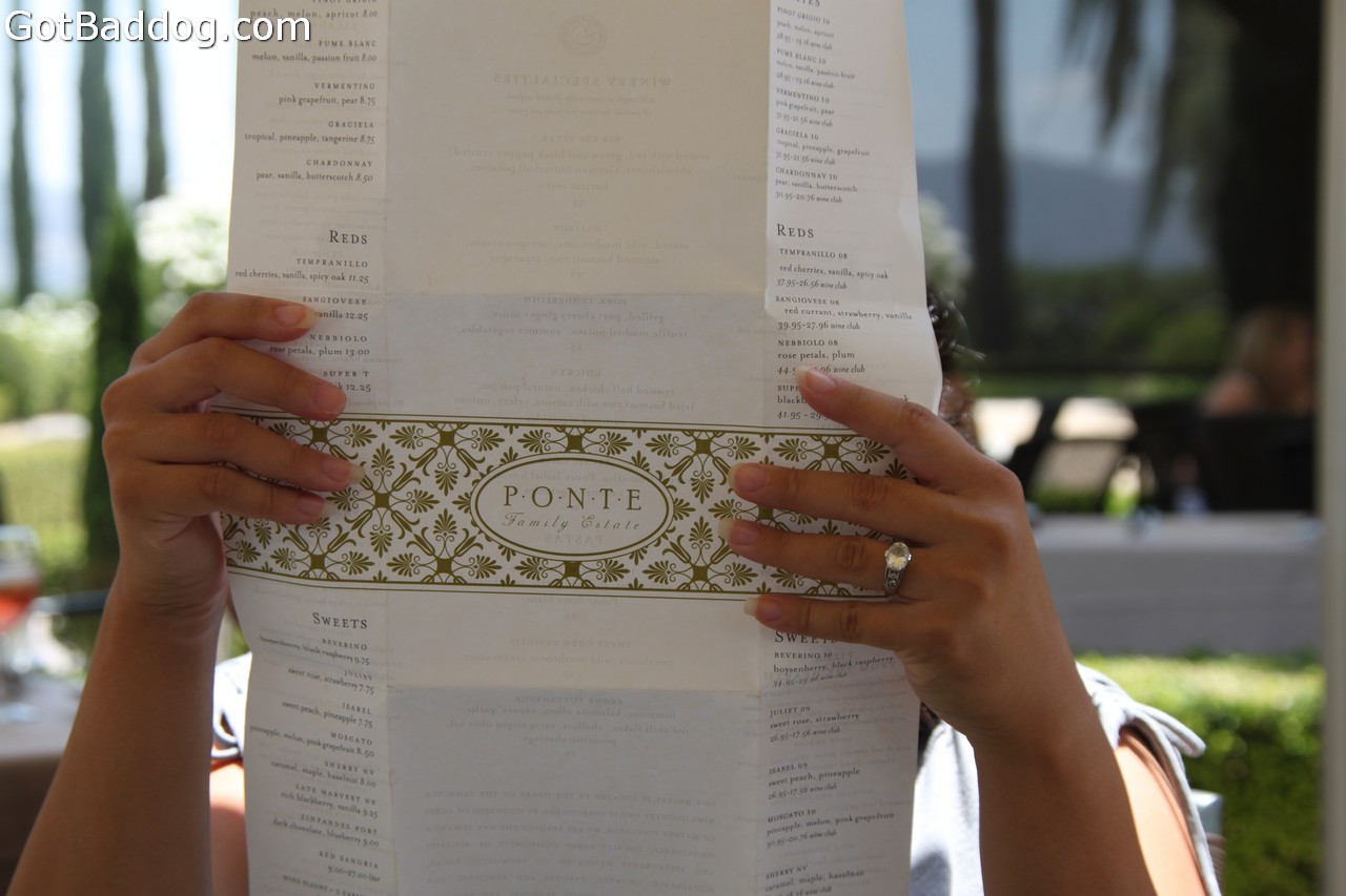 The next day we made plans to meet up with my son and his family at the Ponte Family Estate. Since we got there early, I decided to go for the wine tasting. Not only does Ponte have some very nice wines, but they have extremely generous pours. By the time I finished the tasting and lunch (which was delicious) I was really glad I had my own personal designated driver.