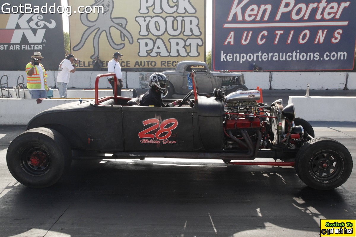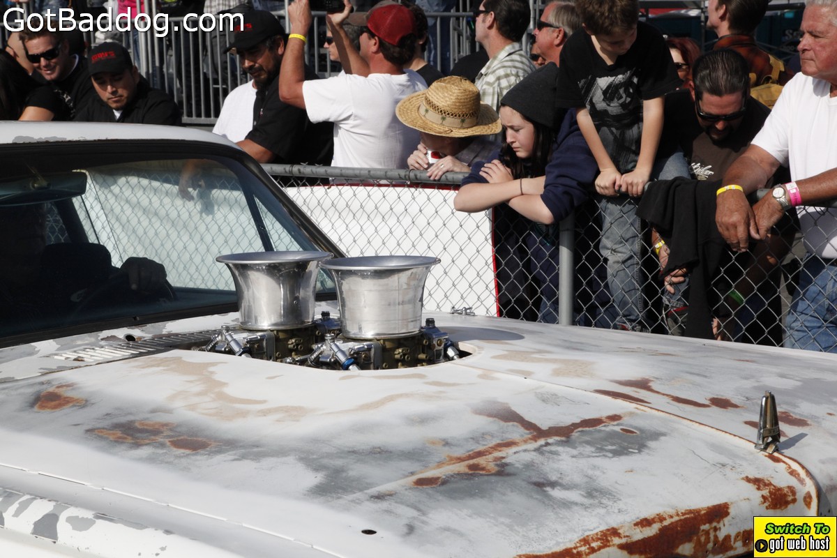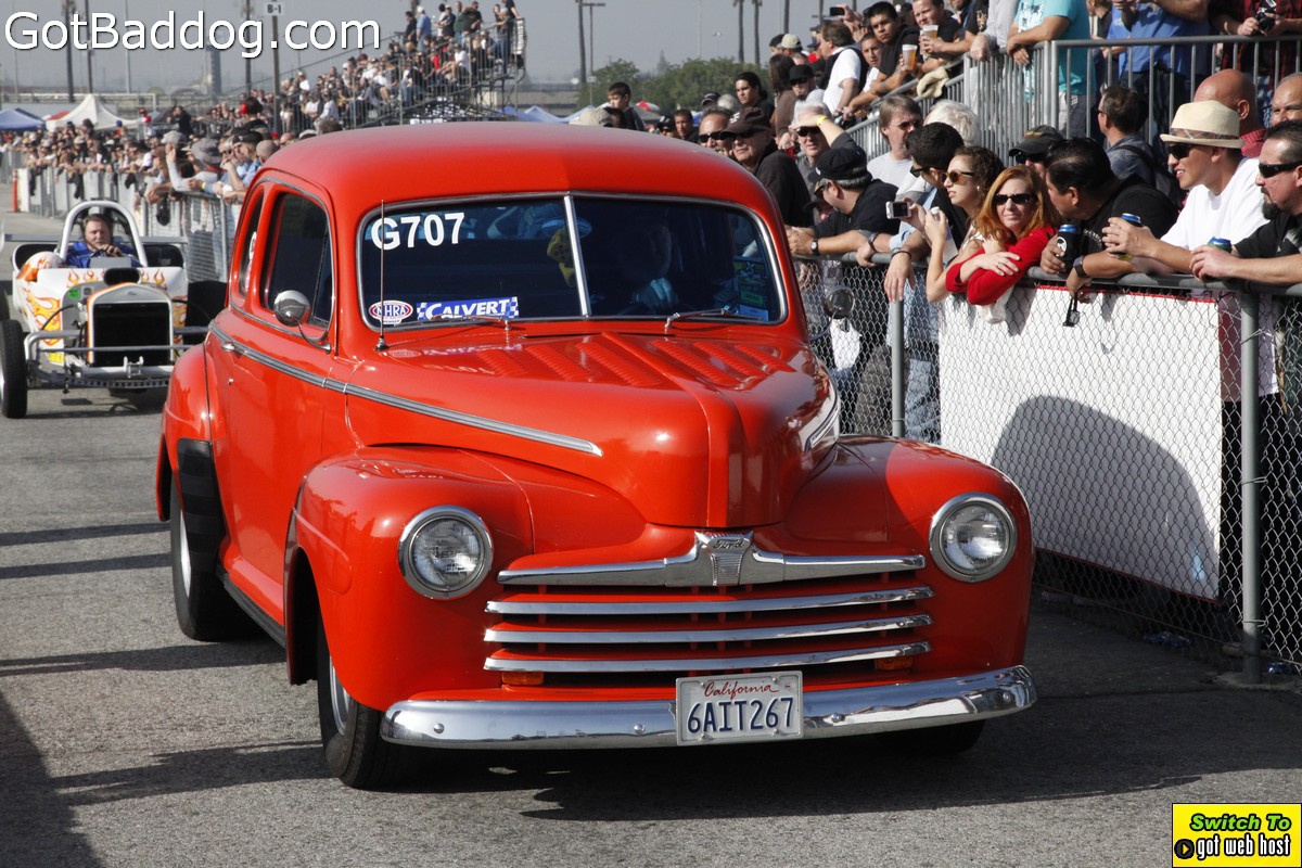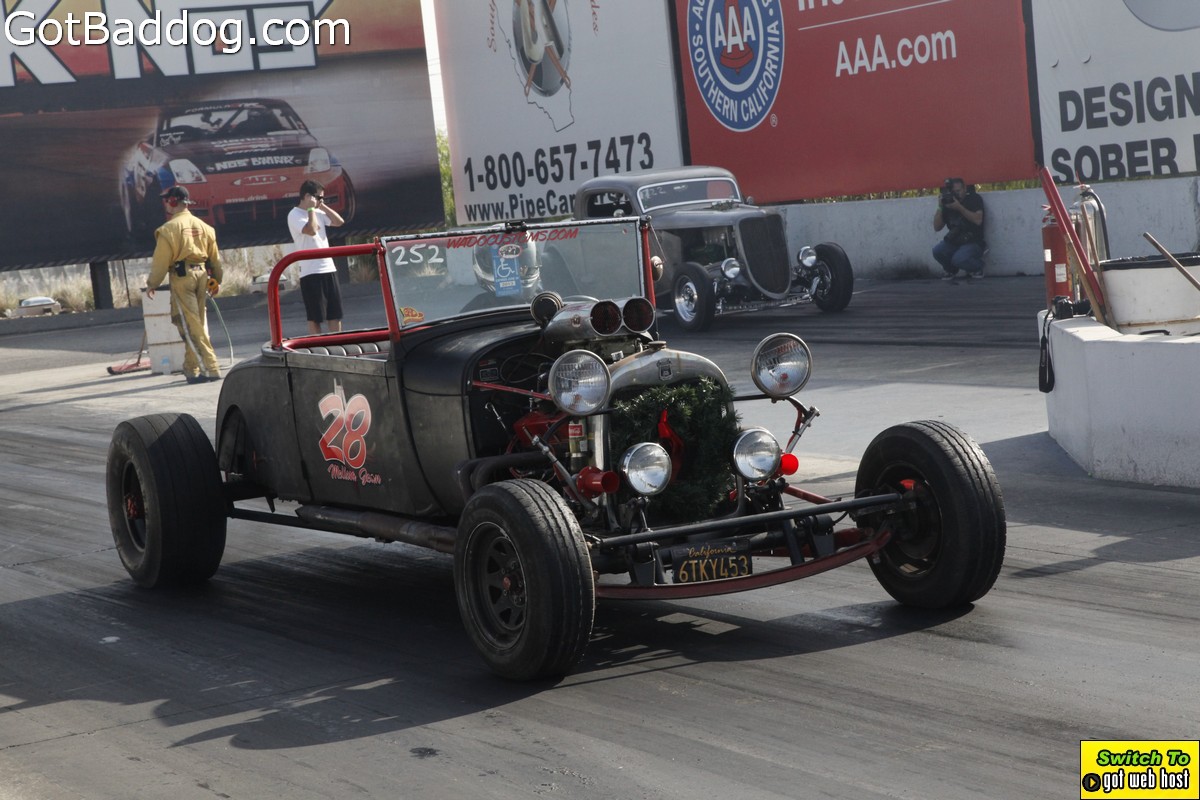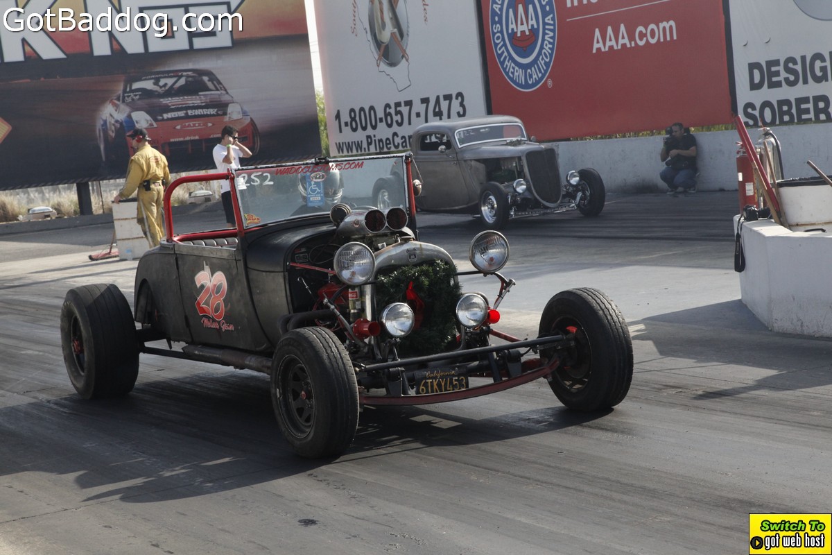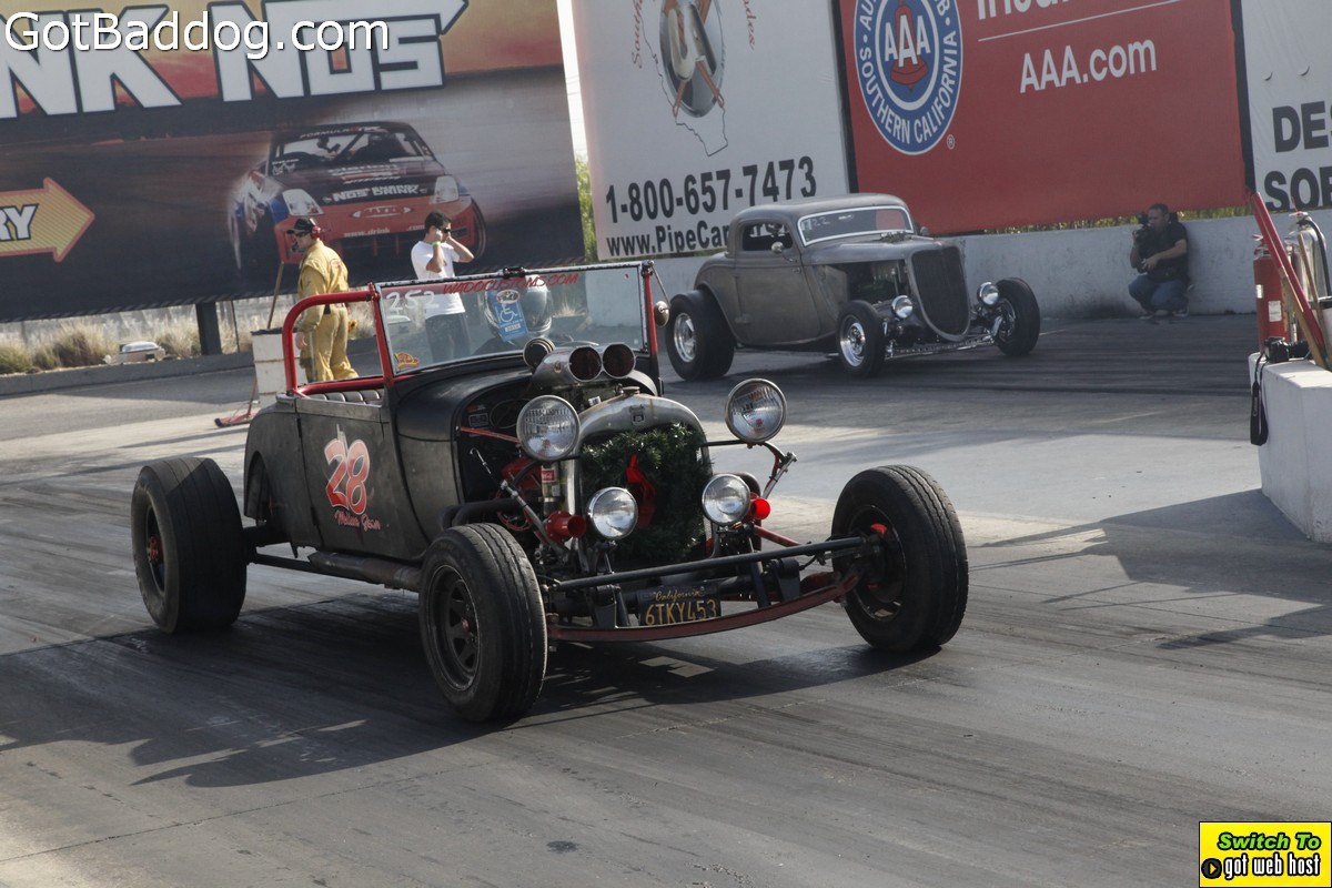 Saturday, December 8, 2012 was the annual Mooneyes Christmas Party, Car show and Drag Races at Irwindale Dragstrip. I am not really sure how long they have been having this event; but I have been photographing it since 2010. It is a fun event. The car show is limited to pre-1965 model years; and the drag races are limited to pre-1969 model years. In addition, there was a Pinup Girl contest, tons of vendors selling everything you could want to customize your hot rod or fuzzy dice for your lowrider as well as food and drink. Live music was provided by Gambler’s Mark, Dead Beat Daddy, Hot Rod Trio and Dynotones.