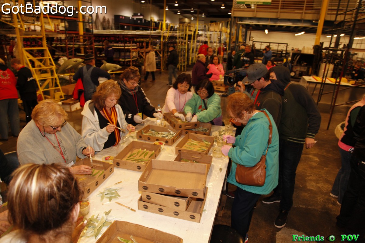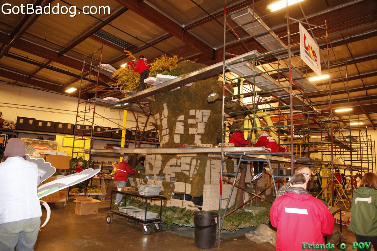 If you noticed my photos from last Wednesday you cannot help but notice that there has been significant progress made on the actual decorating of the floats. Last week when we were there it was a construction scene with the sound of metal being ground and the warehouse smelled of paint. Last night the construction crews were gone and the troops of people, young and old, were carefully applying flowers and seeds to every visible portion of the floats, and some portions that are not exactly visible to the normal viewer but might be noticed by a judge. Instead of paint, the aroma was predominantly flowers with a hint of glue.